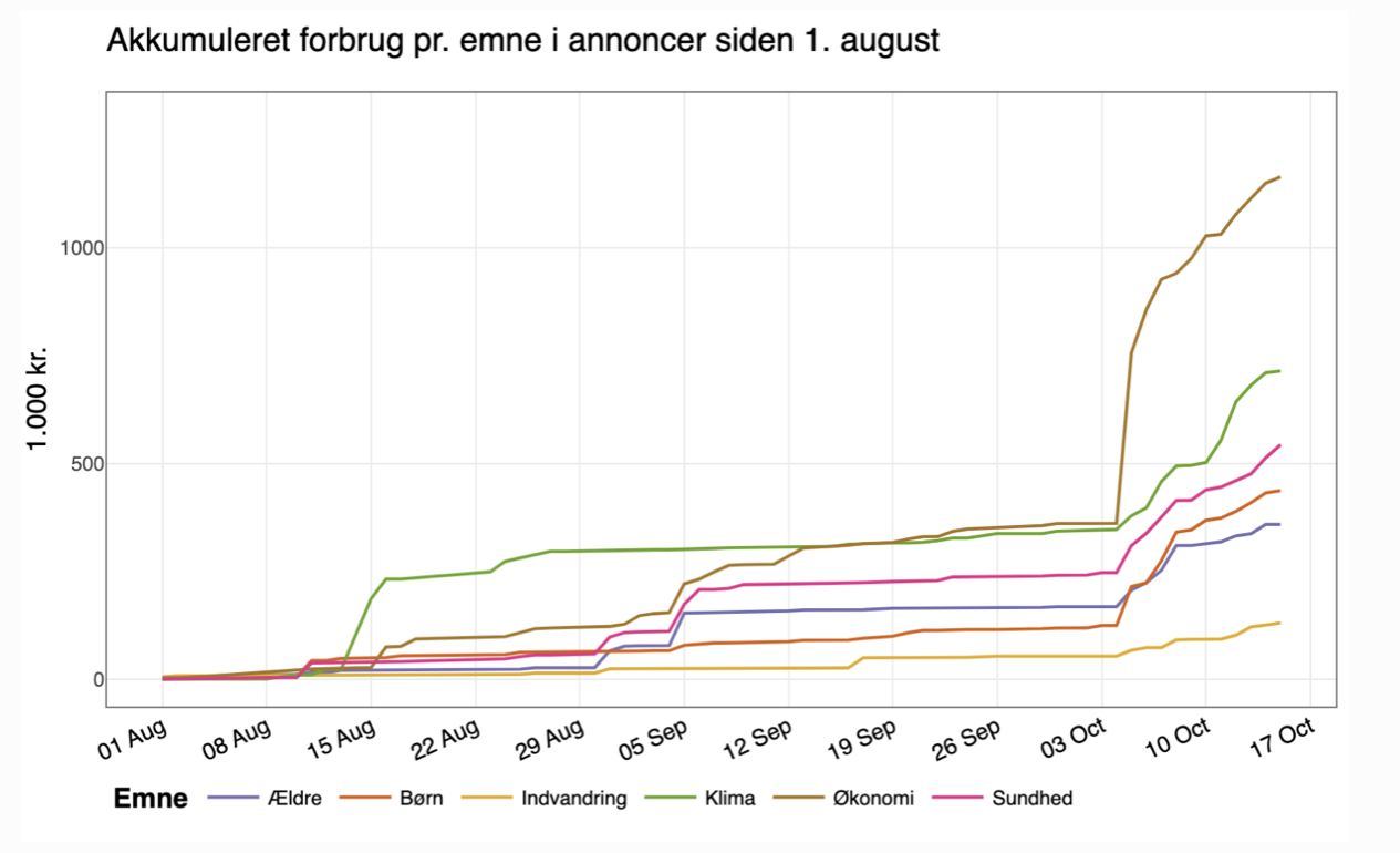 Grafen over viser hvilke tema partiene kaster annonsekronene sine etter på Metas plattformer (Facebook og Instagram). Fra 1. august til 15. oktober er det på tvers av partiene brukt over 1,1 millioner på annonser som handler om økonomi, etterfulgt av klima (714 000 kr) og helse (542 000 kr). Frem til valget ble utskrevet lå økonomi og klima helt likt, før økonomi gjorde et kjempebyks. Partiene på høyrefløyen har tradisjonelt størst troverdighet på økonomisk politikk, og venstrepartiene på klima. Forbruket på annonser den siste tiden indikerer dermed at det er en hard kamp om dagsorden, noe som kan få stor betydning for valgresultatet.