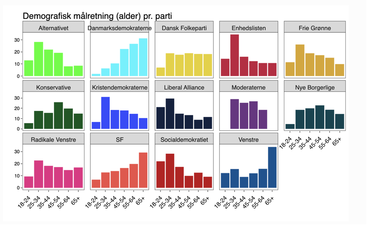 Partiene er bevisste på å nå ut til akkurat de velgerne som med størst sannsynlighet kommer til å stemme på dem. Også når det gjelder alderssegmentering, er det tydelig at partiene fordeler annonsekronene sine strategisk. Grafen over viser at det i år er mange partier som går for å nå unge velgergrupper i digitale kanaler. Dette kan henge sammen med at unge i mindre grad er aktive brukere av tradisjonelle medier, samtidig som de har stemt ved færre valg og dermed kan betraktes som å ha lavere partilojalitet enn eldre velgere.
